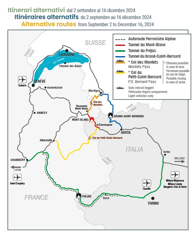 Confartigianato Imprese Vicenza informa che GEIE-TMB, l’organismo che gestisce il traforo del Monte Bianco, ha comunicato che il Traforo sarà completamente chiuso al traffico dalle ore 17.00 di lunedì 2 settembre alle ore 17.00 di lunedì 16 dicembre 2024.
